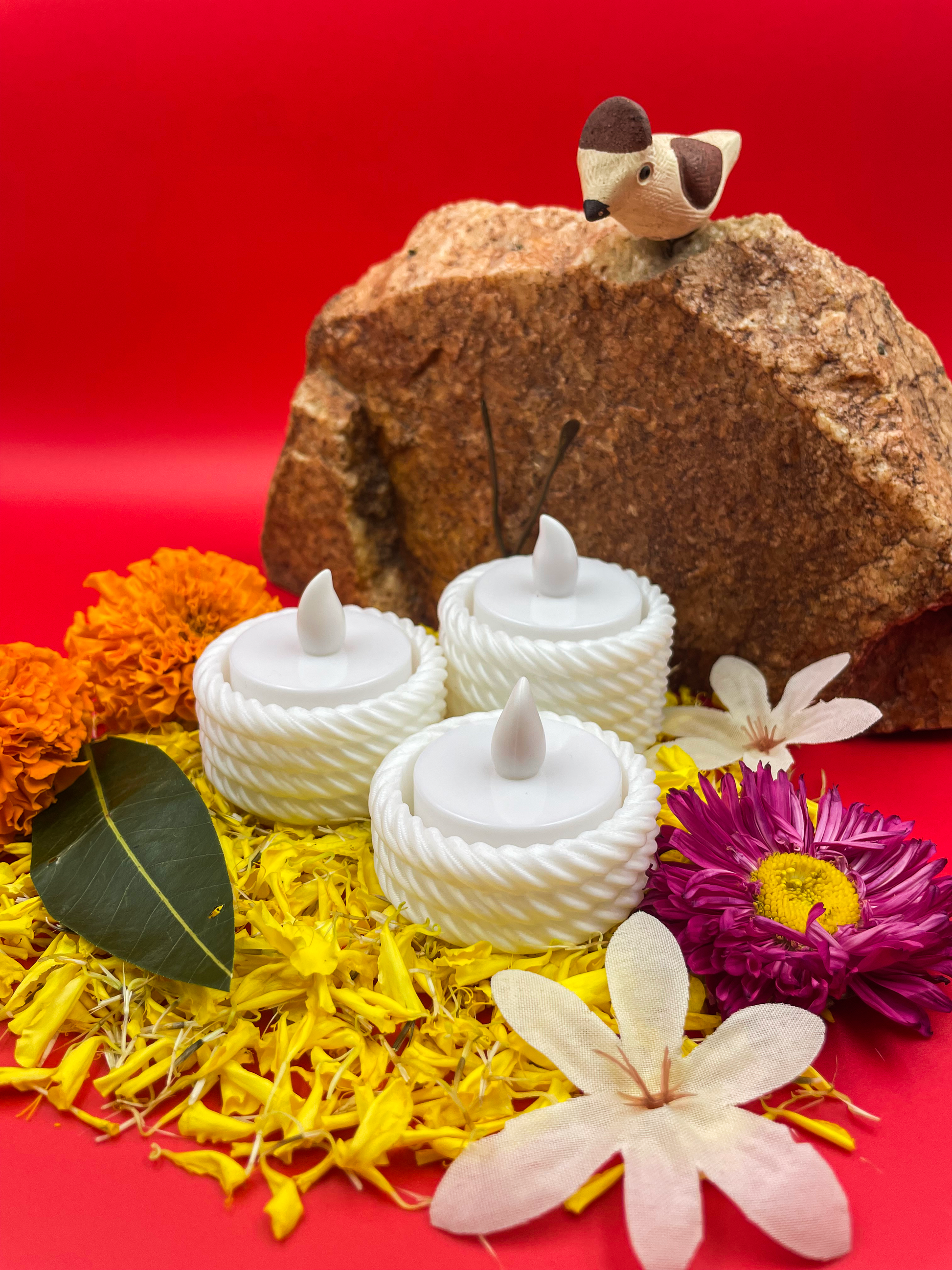 Bring festive charm to your celebrations with our Rope Glow Decorative Diya. Crafted in an elegant lotus-inspired design, this diya adds a touch of sophistication to your home décor. It's unique shape and glossy white finish make it perfect for Diwali, poojas, weddings, or any special occasion. Place it with fresh flowers or rangoli to create a warm and inviting festive vibe.